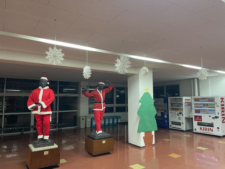 玄関ロビーでは、ボランティア局の生徒が少しずつクリスマスムードを盛り上げてくれています。銅像にサンタの衣装、クリスマスツリーも飾ってくれました。