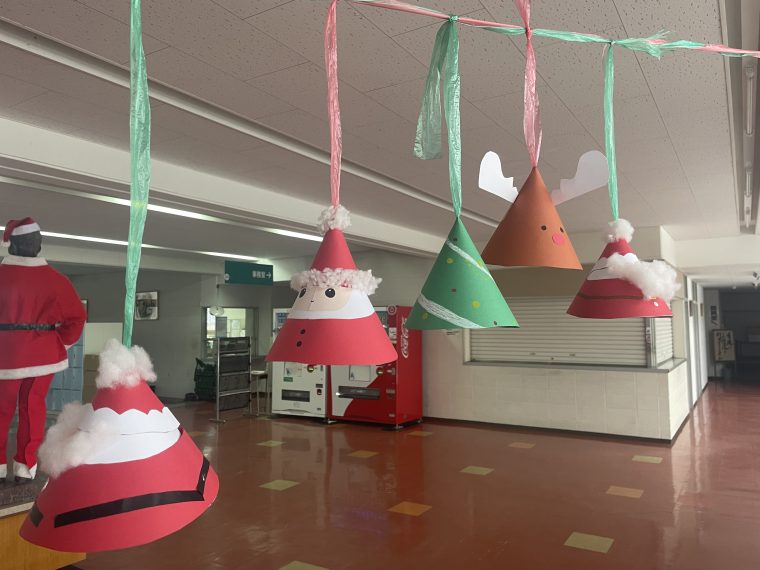 玄関ロビーでは、ボランティア局の生徒が少しずつクリスマスムードを盛り上げてくれています。銅像にサンタの衣装、クリスマスツリーも飾ってくれました。